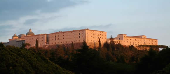 The town of Cassino, north of Naples, is notable due in large part to the site of the first monastery of the Benedict of Nursia built around 529. Enclosed by a fortifying wall the monastery sits above the small town. At Monte Cassino, Benedict wrote the Benedictine Rule that became the founding principle for western monasticism and the place of his death. Due to its protected location, Monte Cassino was constantly a strategically important battlefield starting with the attack of the Lombards in 584 to the air raids during World War II in 1944. Surviving these onslaughts and an earthquake in 1349 and the sacking of Napoleon’s troops in 1799 the monastery endured destruction and its many attempts and rebuilding. Through the financing of the Italian State, the Abbey was totally rebuilt after the war and reconsecrated by Paul VI in 1964.